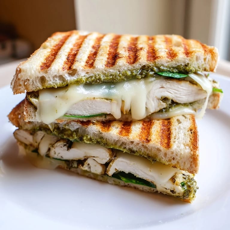 Save My neighbor Sofia knocked on my door one Sunday holding a jar of her grandmother's pesto and a loaf of ciabatta still warm from the bakery. She insisted I try making these panini her way, with the chicken sliced thin and the press hot enough to leave those perfect grill marks. The smell of basil and melted cheese filled my kitchen within minutes, and I understood why she'd been so insistent. That afternoon turned into an impromptu lunch on the porch, and I've been making these sandwiches ever since. They're simple, but something about the combination feels like a small celebration every time.